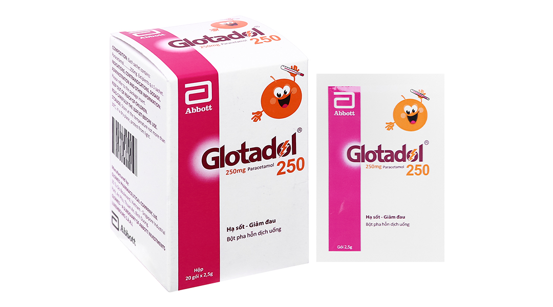 Gói thuốc Glotadol 250mg chứa thành phần chính là Paracetamol, được sản xuất bởi Công ty Cổ phần Dược phẩm Glomed. Bột pha hỗn dịch uống Glotadol có công dụng giúp hạ sốt và giảm các cơn đau do cảm cúm hay cảm lạnh thông thường, đau đầu, đau họng, mọc răng, tiêm ngừa, cắt amiđan.